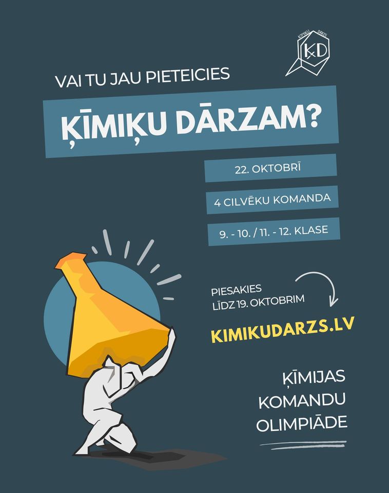 Vairāk informācijas, olimpiādes nolikums, programma un pieteikšanās līdz 19. oktobrim: kimikudarzs.lv